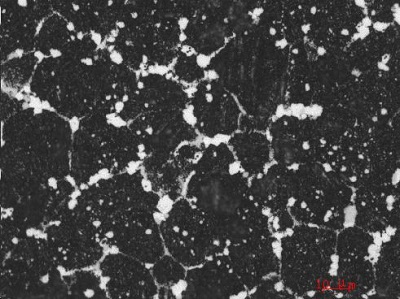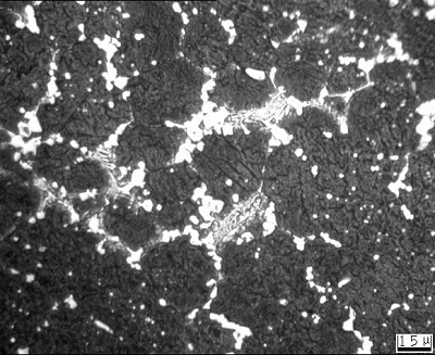 過 燒 在金相組織中晶界上出現(xiàn)萊氏體共晶組織,并呈塊狀或半網(wǎng)狀分布(圖2),還有可能出現(xiàn)黑色組織。